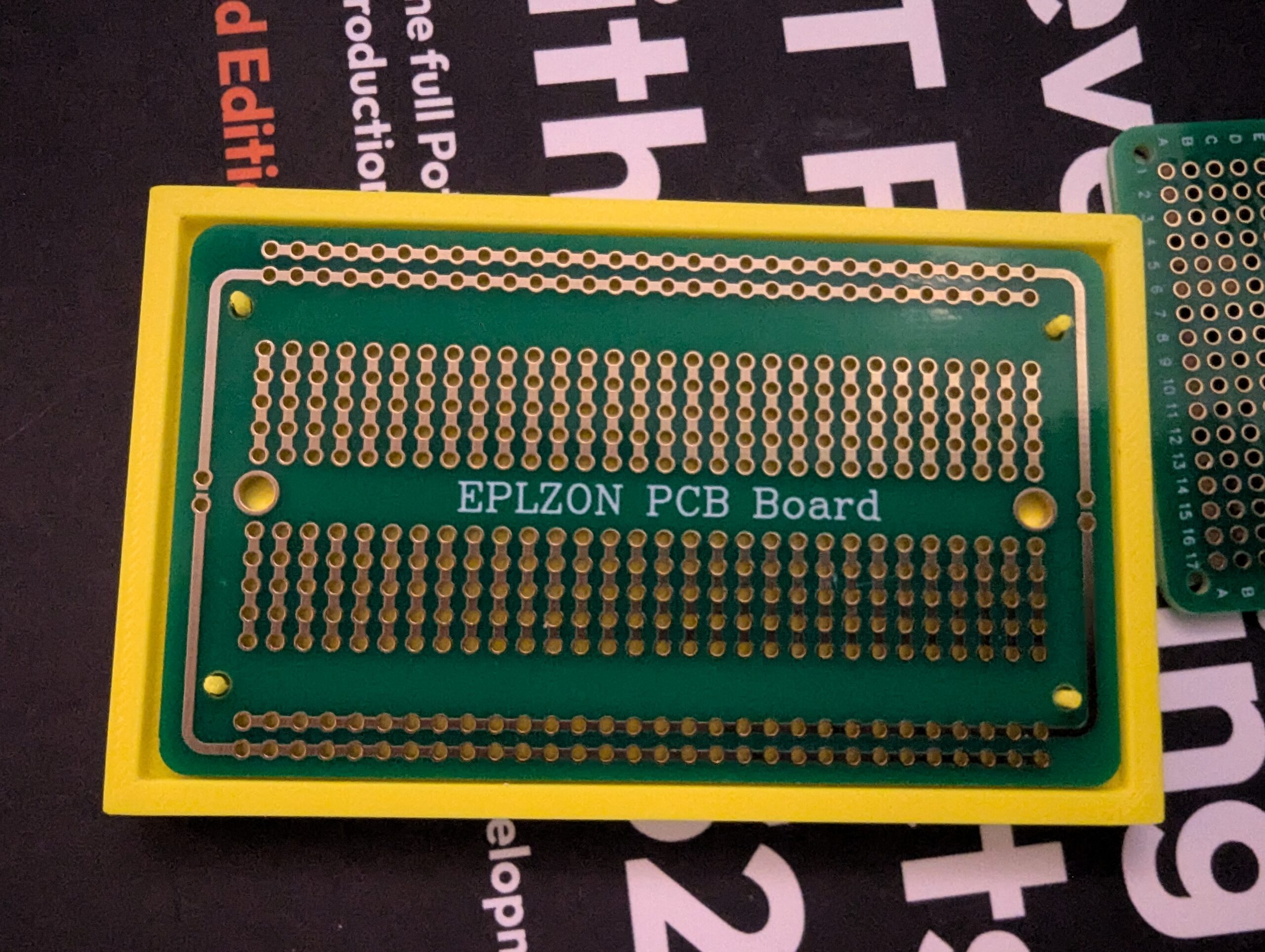 I started working on a 3D printed case for the circuit board, but that is still a work in progress. Here is how the solderable breadboard will fit in the case. This is just a prototype to make sure I got the dimensions correct and put the locating pins in the correct arrangement.